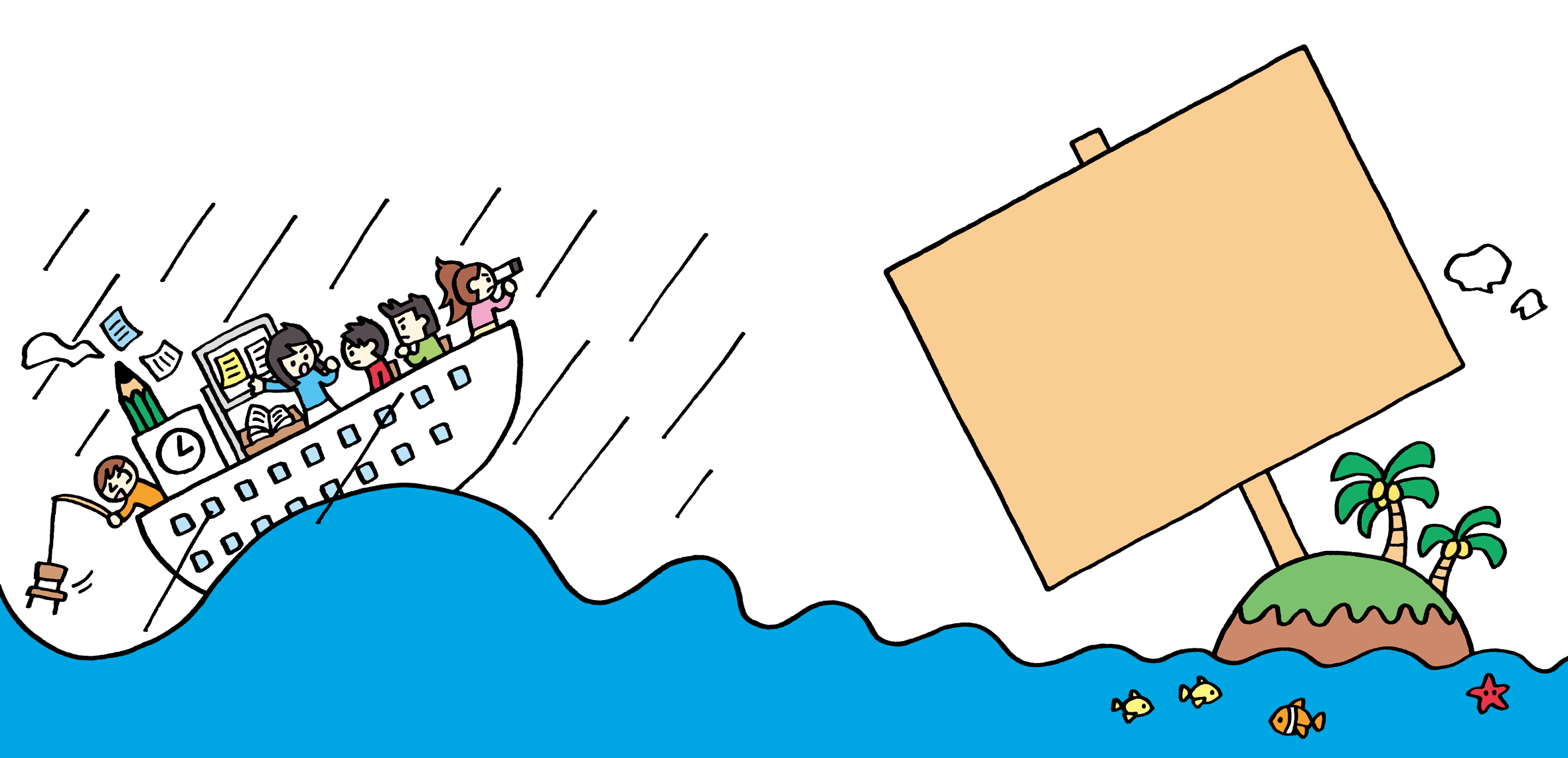 学事出版「校内研究・研修で職員室が変わった!」見開きイラスト