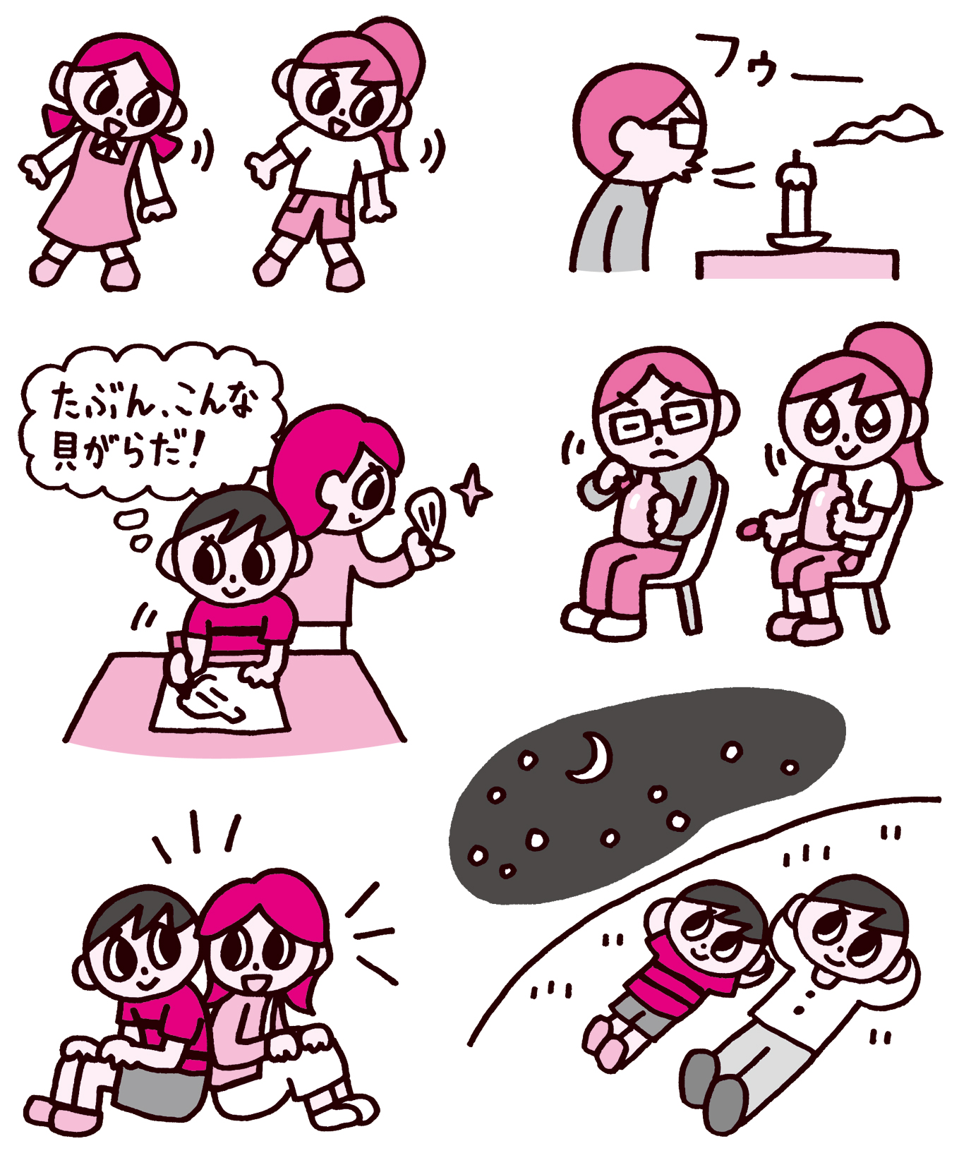 子どもたちや親子でマインドフルネスのワークに取り組んでいる様子を描きました。